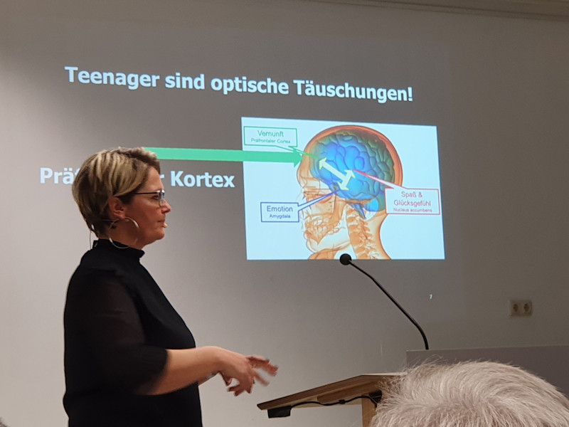 Kira Liebmann umriss das Thema Pubertät ganzheitlich, angefangen von den sichtbaren körperlichen Veränderungen der Kinder ("Man riecht sie bevor man sie sieht."), der Entwicklung im Gehirn sowie die Erwartungshaltung der Eltern an ihre Kinder. Immer wieder erklärte Kira Liebmann auch die Ursachen für offensichtliche Veränderungen und klassische Konfliktsituationen, wie zum Beispiel das Bedürfnis der Kinder am Wochenende auszuschlafen. Untermalt mit eigenen persönlichen Erfahrungen gab Kira Liebmann den Zuhörern das Gefühl, dass sie mit ihren Problemen nicht alleine seien.